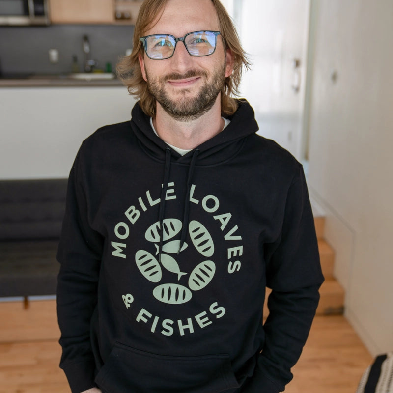 Stay cozy and stylish with this soft, black pullover hoodie, featuring the iconic Mobile Loaves & Fishes logo. Made from a premium cotton-blend fabric, this hoodie offers a relaxed fit, making it perfect for layering or wearing on its own. Its warm, plush interior and adjustable drawstring hood keep you comfortable during chilly days or cool evenings. The minimalist black design with the MLF logo boldly placed on the chest lets you show your support for a great cause in a classic way. Ideal for casual outings or lounging at home, this hoodie is your go-to for both comfort and meaning.