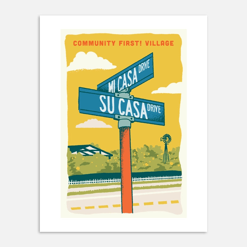We worked with a local artist to create this image of the iconic Community First! Village intersection, Mi Casa and Su Casa. Situated near Genesis Gardens, this intersection in the village is a popular area for neighbors working in the gardens or heading off to spend time in the Living Room.