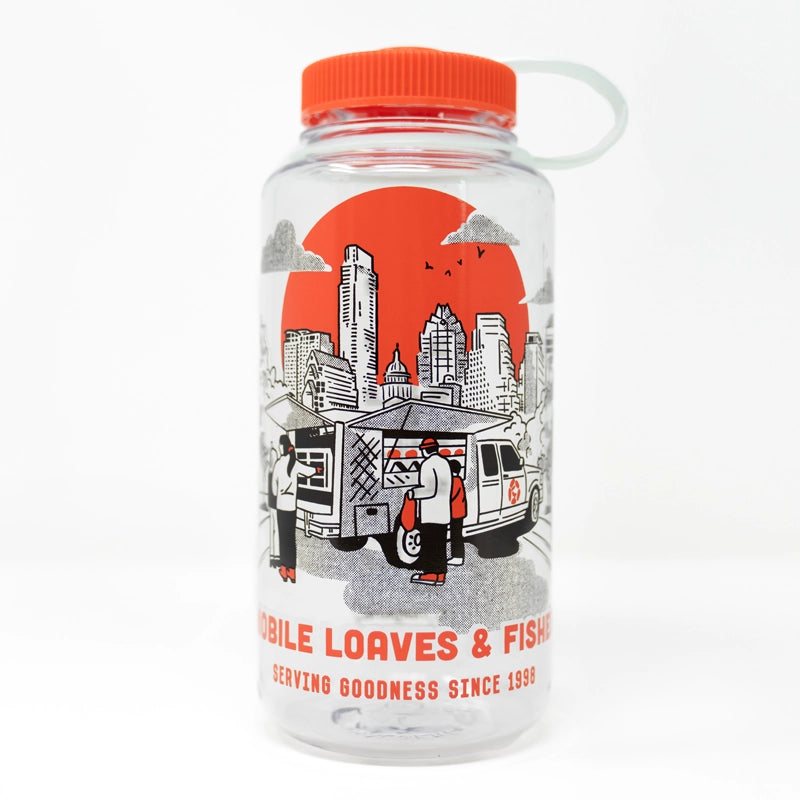 We're going back to where it all started. This special edition Mobile Loaves & Fishes Nalgene features a vintage-inspired illustration of the iconic MLF food truck set against the Austin skyline. It’s a nod to the early days of serving with dignity, one meal at a time, and a celebration of the city that’s been with us from the start.