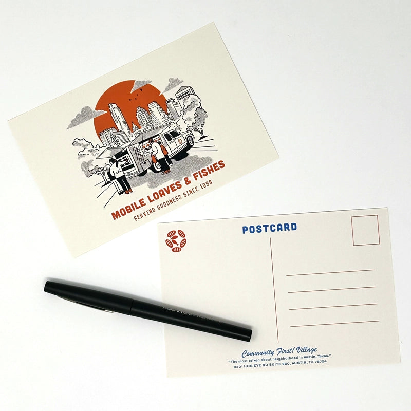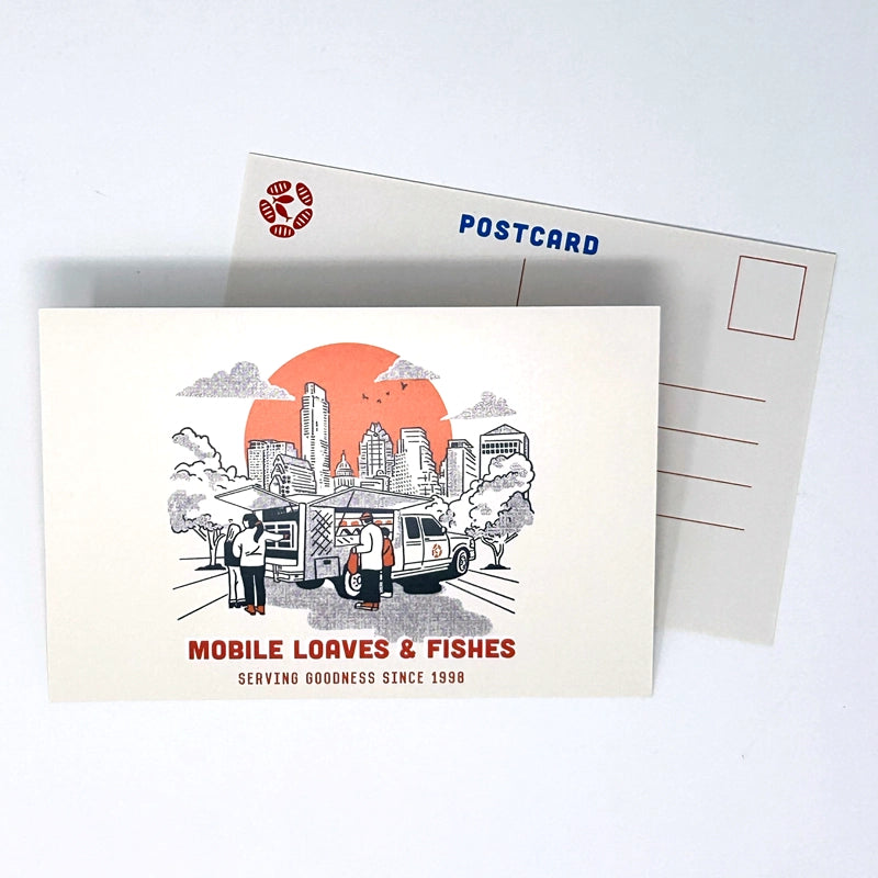 Going back to where it all started. This special edition Mobile Loaves & Fishes postcard features a vintage-inspired illustration of the iconic MLF food truck set against the Austin skyline. It’s a nod to the early days of serving with dignity, one meal at a time, and a celebration of the city that’s been with us from the start.