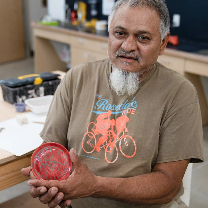 Jose has been working with power tools in the construction industry most of his life, so when he decided to take up wheel throwing at our Community Art House, the process came naturally to him. A neighbor at Community First! Village since 2022, Jose is a completely self-taught artist, and we’re thrilled to partner with him in the Art House.