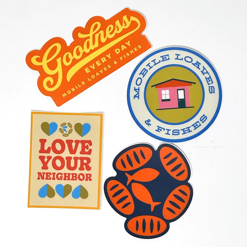 Our Sticker Pack #5 features our new MLF Tiny Home sticker, Love Your Neighbor sticker, Goodness Everyday sticker and the iconic MLF logo sticker.