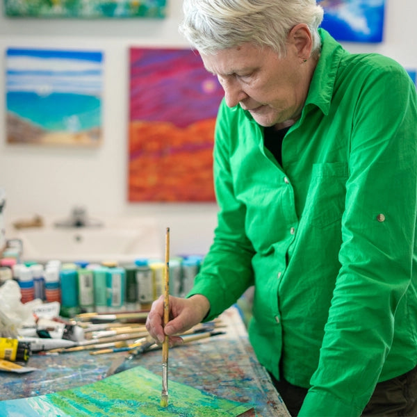 The artwork for these notecards was painted by Ute Dittemer, a very talented artist living in Community First! Village. Ute has been a neighbor since 2017 and earns a dignified income creating art through our Community Works program.